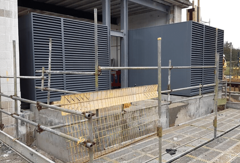 The generating set was installed with both inlet and outlet attenuators, which were designed to achieve a sound level of 72dBA @ 1m per set. The attenuators were finished in enhanced paint and were supplied with weather louvres and motorised inlet/gravity outlet louvres.