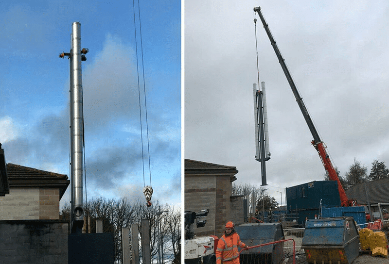 WB Power provided a twin-wall exhaust flue for each new generating set. The flues were designed and installed to exit the room adjacent to the discharge attenuators. They then rose up a mast to a height of 15m. Due to incoming emergency aircraft on the hospital grounds, the flue included three aircraft warning lights and lightening protection.